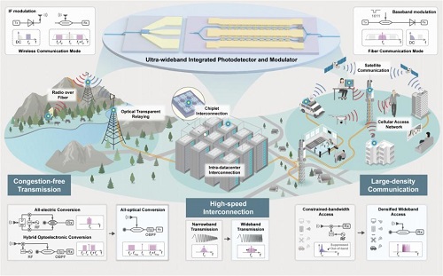 為此,北京大學(xué)聯(lián)合鵬城實驗室、上??萍即髮W(xué)、國家信息光電子創(chuàng)新中心等研發(fā)團(tuán)隊,創(chuàng)出“光纖—無線一體化融合通信”概念,并采用集成光學(xué)方案,成功研制出250GHz(千兆赫茲)以上超寬帶集成光子器件。在此基礎(chǔ)上開發(fā)出的新系統(tǒng)實現(xiàn)了光纖通信單通道512Gbps(千兆比特每秒)信號傳輸、無線通信單通道400Gbps信號傳輸。