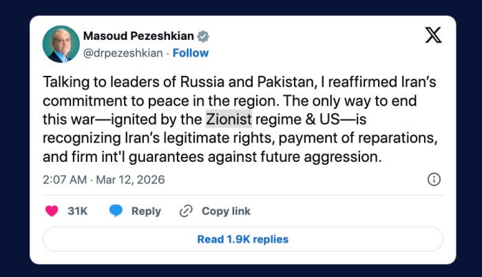 據(jù)報(bào)道,佩澤希齊揚(yáng)表示,結(jié)束當(dāng)前由美國和以色列挑起的戰(zhàn)爭的“唯一途徑”,是承認(rèn)伊朗的合法權(quán)利、支付戰(zhàn)爭賠償,并由國際社會提供防止未來侵略行為的堅(jiān)定保證。