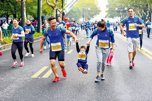 11月4日,多地舉辦馬拉松比賽,眾多長跑愛好者參與其中,享受運動帶來的快樂。圖為家長帶著孩子參加浙江杭州舉行的馬拉松比賽。據(jù)新華社 徐暉 攝