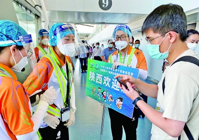 9月14日,在西安咸陽(yáng)機(jī)場(chǎng),工作人員為參加全運(yùn)會(huì)的記者提供服務(wù)。本報(bào)記者 郭紅松攝/光明圖片