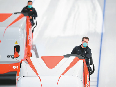 國(guó)家速滑館的中外工作人員在比賽間隙修整賽道。新華社記者 張晨霖 攝