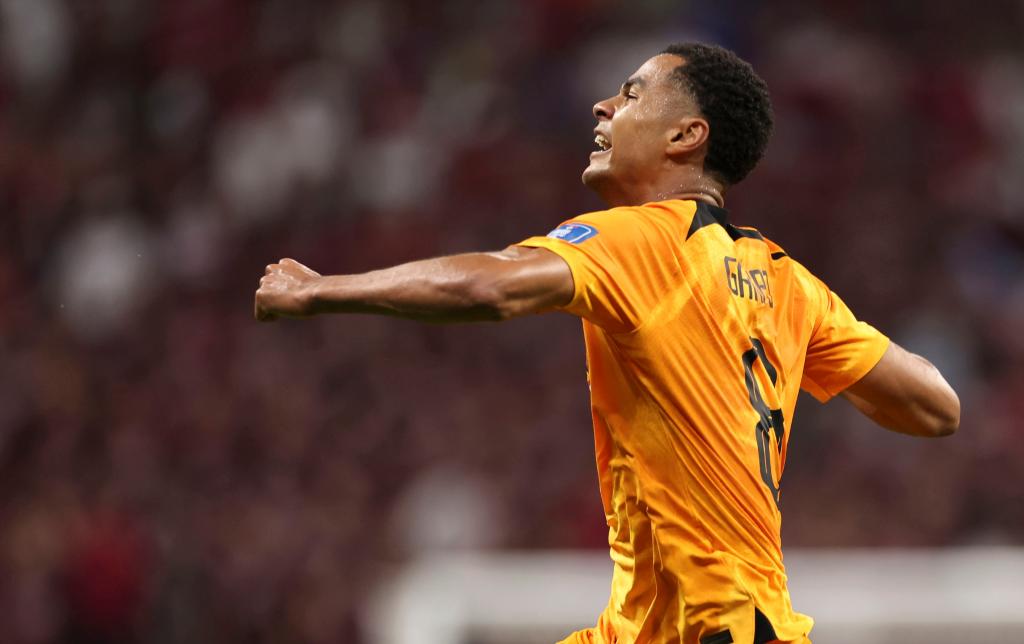 11月29日,荷蘭隊(duì)球員科迪·加克波在比賽中進(jìn)球后慶祝。新華社記者 徐子鑒 攝