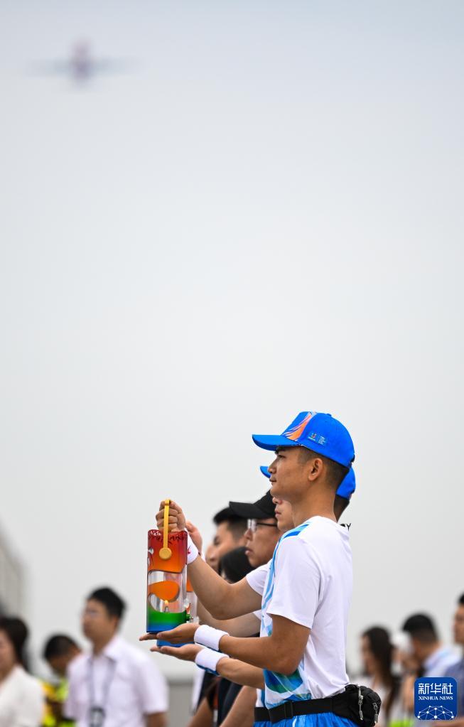 6月8日,在成都天府國際機(jī)場(chǎng),“中國民航英雄機(jī)長(zhǎng)”劉傳健執(zhí)飛護(hù)送成都大運(yùn)會(huì)火炬火種的航班。新華社記者 王曦 攝