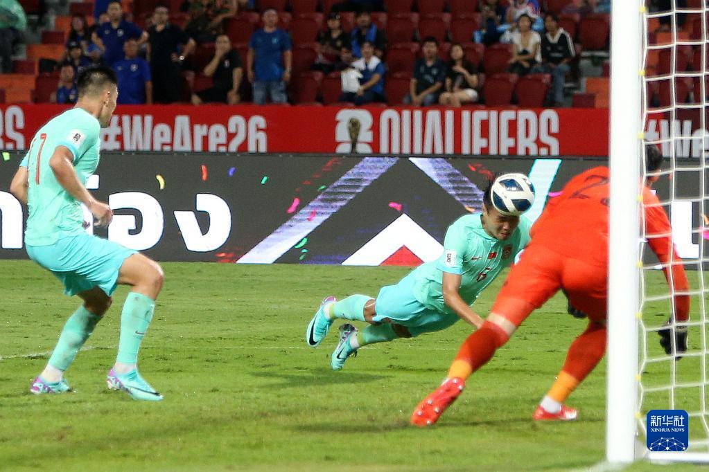 11月16日,中國隊(duì)球員王上源(中)在比賽中頭球攻門得分。當(dāng)日,在泰國曼谷舉行的2026世界杯預(yù)選賽亞洲區(qū)36強(qiáng)賽C組比賽中,中國隊(duì)以2比1戰(zhàn)勝泰國隊(duì)。新華社記者 王騰 攝