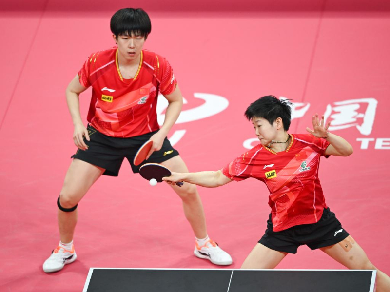 12月10日,王楚欽/孫穎莎(右)在混雙比賽中回球。新華社記者 王曦 攝