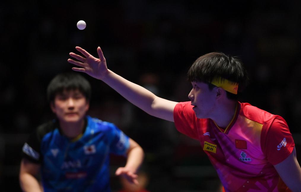 2月22日,王楚欽(右)在第二盤(pán)比賽中發(fā)球。新華社記者 陶希夷 攝