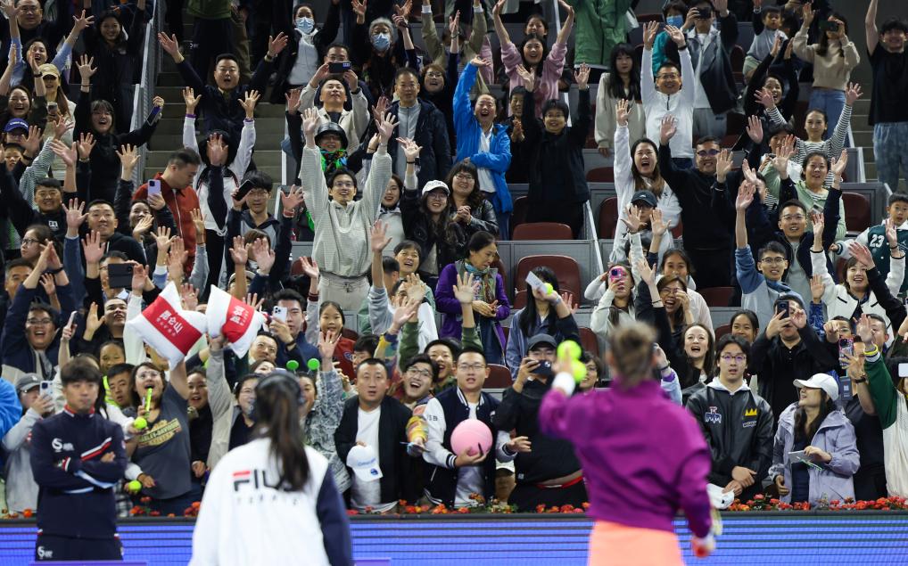 這是2024年9月30日,鄭欽文在2024中國網(wǎng)球公開賽女單第三輪比賽后和觀眾互動(dòng)。新華社記者 白雪飛 攝