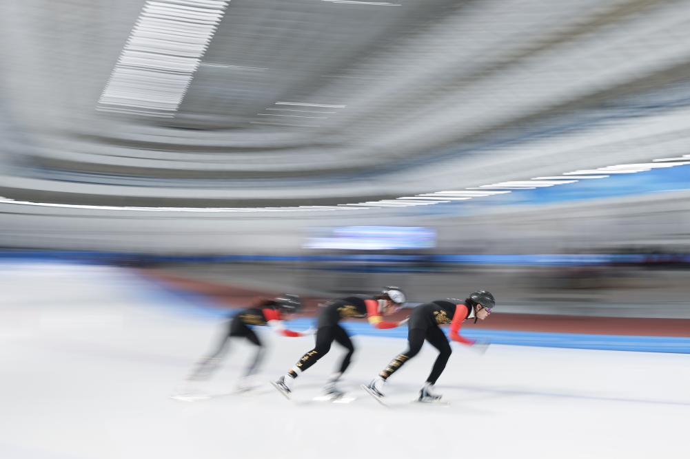 2024年12月15日,2024-2025賽季中國杯速度滑冰精英聯(lián)賽第四站暨亞冬會測試賽女子團(tuán)體追逐比賽在黑龍江省冰上訓(xùn)練中心舉行。新華社記者 張濤 攝