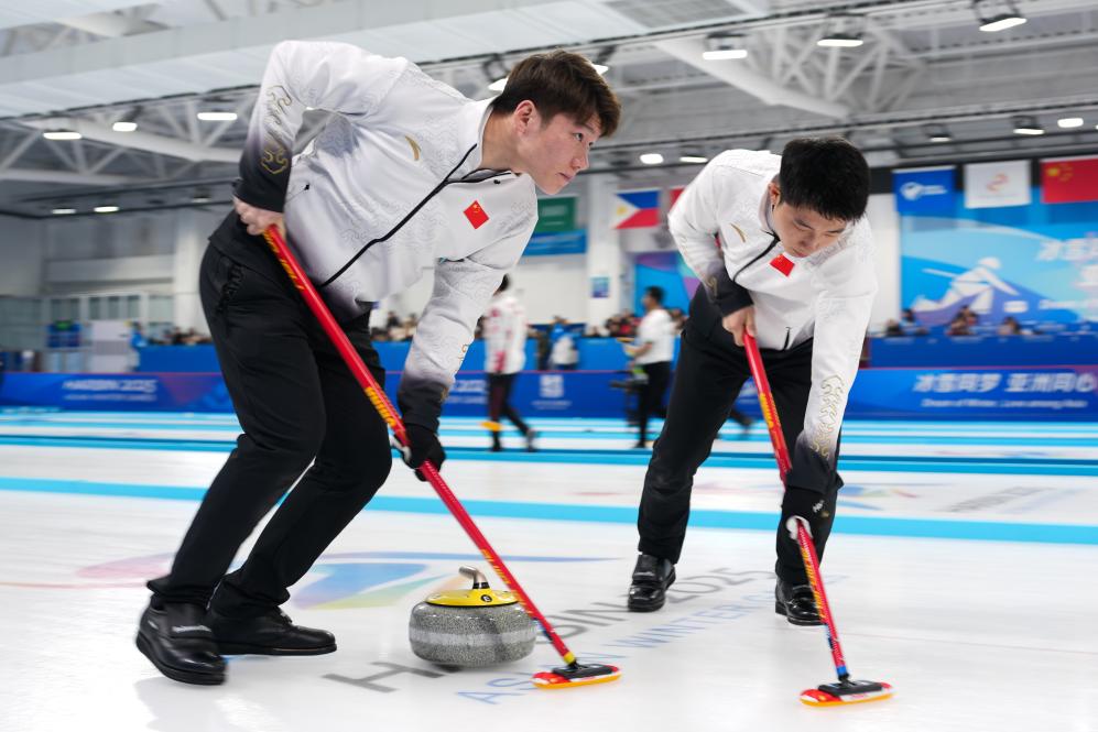 2月10日,中國隊選手王智宇(左)、費學(xué)清在比賽中擦冰。新華社記者 鄭煥松 攝