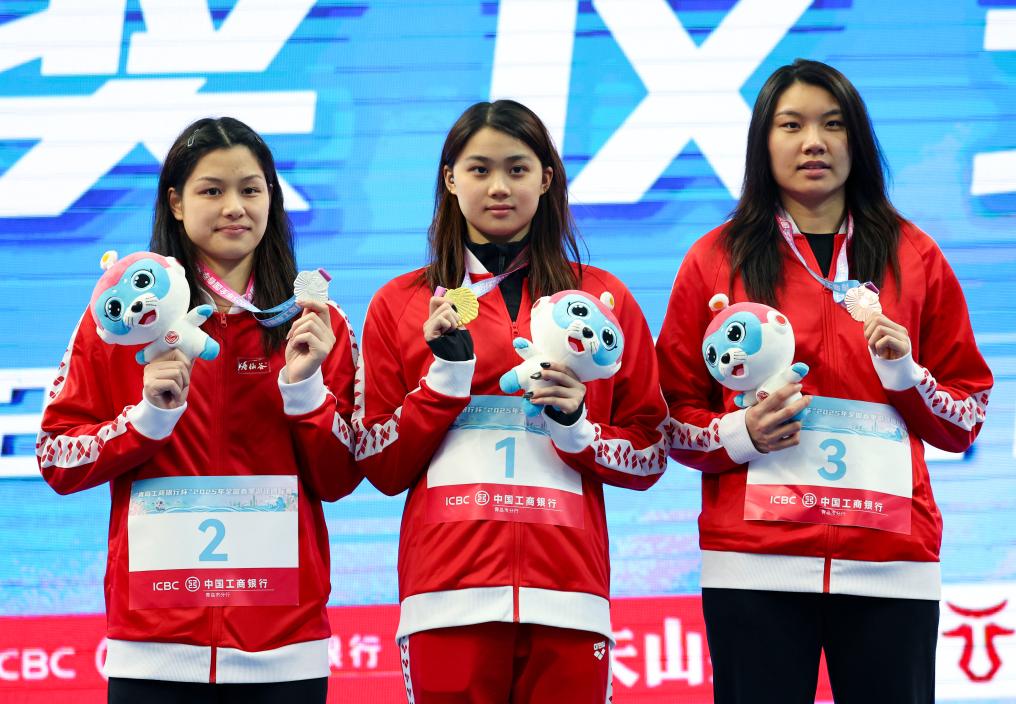 3月18日,冠軍浙江隊(duì)選手鄭惠予(中)、亞軍浙江隊(duì)選手余依婷(左)和季軍浙江隊(duì)選手柳雅欣在女子200米個(gè)人混合泳頒獎(jiǎng)儀式上。新華社記者 雒圓 攝 在首日的女子項(xiàng)目中,浙江隊(duì)選手鄭惠予以2分12秒18的成績(jī)奪得200米個(gè)人混合泳金牌,她的隊(duì)友余依婷獲得銀牌,成績(jī)是2分12秒47。本次比賽報(bào)名11個(gè)單項(xiàng)的余依婷堪稱(chēng)泳池“頭號(hào)勞?!?,她說(shuō):“今年的冬訓(xùn)是我近年來(lái)感覺(jué)最好的一次,我希望通過(guò)本次比賽以賽代練,每一場(chǎng)比賽都發(fā)揮出高水平。而且我這次報(bào)了200蝶、400自等過(guò)去沒(méi)怎么游過(guò)的項(xiàng)目,想看看自己現(xiàn)在的實(shí)力在哪里。我的目標(biāo)就是希望自己不要有傷病,順利比完所有項(xiàng)目,不影響后面的比賽?!?/p> 在女子100米自由泳比賽中,江西隊(duì)選手程玉潔奪冠,成績(jī)是53秒91,余依婷和柳雅欣分列第二、三位。