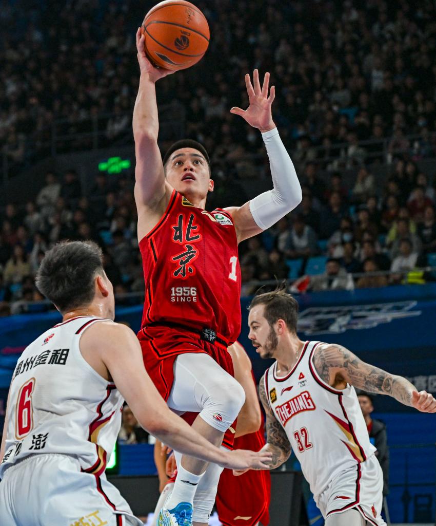 3月31日,北京隊球員曾凡博(上)在比賽中投籃。新華社記者 孫凡越 攝