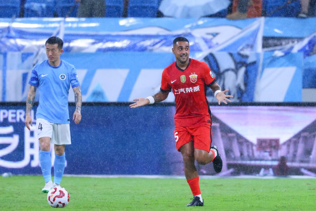 6月30日,上海海港隊球員萊昂納多(右)在比賽中慶祝進球。新華社發(fā)(彭志剛 攝)
