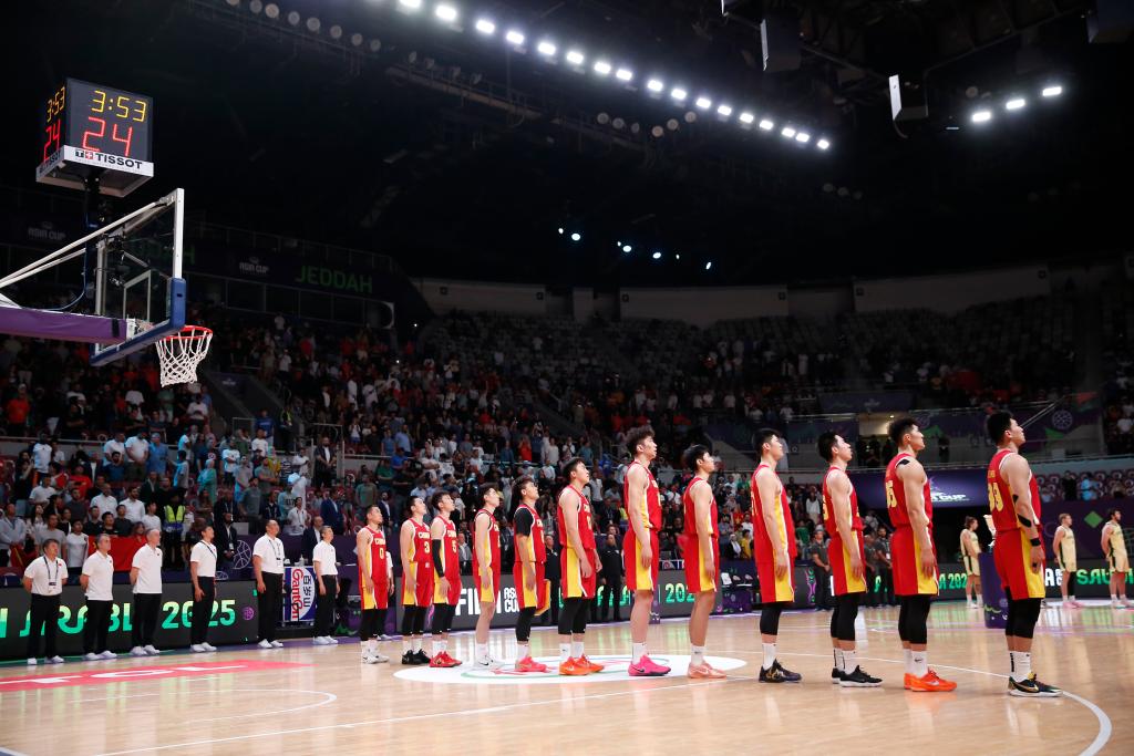8月17日,在沙特阿拉伯吉達舉行的2025國際籃聯(lián)亞洲杯決賽中,中國隊89比90不敵澳大利亞隊,獲得亞軍。圖為中國隊球員在賽前奏唱國歌儀式上列隊。新華社記者 王東震 攝