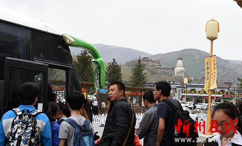 4月30日,游客們正井然有序乘坐該景區(qū)免費(fèi)提供的旅游大巴。