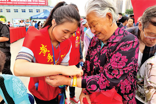 參與活動的愛心志愿者通過豐富多彩的文藝節(jié)目,宣傳黃手環(huán)的正確使用方法,還向廣大市民講解有關(guān)老年人的護(hù)理知識和一些急救常識,相關(guān)醫(yī)療機(jī)構(gòu)派出專業(yè)人員在現(xiàn)場開展了義診活動,市老齡辦對本次慈善公益活動給予了大力支持。圖為志愿者在為一位老人戴上黃手環(huán)。(魯明強(qiáng) 攝影報道)