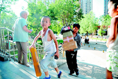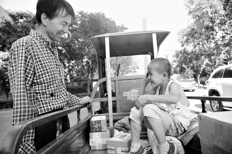 “您好!快遞來了,請(qǐng)下樓接收您的快遞……”這是一位很特別的“快遞小哥”,他叫王志偉,今年7歲。他的爸爸是一名快遞員,名叫王貴生,今年49歲,山西靜樂人,右臂殘疾。暑假來了,為了能和爸爸在一起,小志偉就跟著爸爸每天穿梭在城市的大街小巷。爸爸負(fù)責(zé)拆件、分揀,兒子負(fù)責(zé)打電話通知客戶。