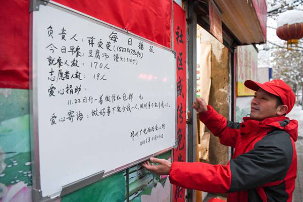 圖說:志愿者在懸掛“每日播報(bào)”,將早餐內(nèi)容、就餐人數(shù)等信息公布在愛心粥屋門口(11月23日攝)。圖片來源:新華社