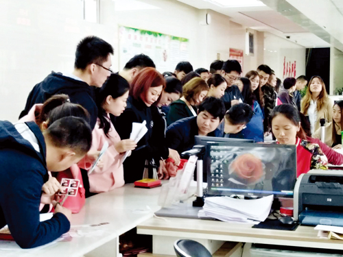 當日工作人員一上班,準新人們有秩序地魚貫而入,并在領證柜臺前排起了長隊。小米和小趙是國慶節(jié)訂的婚,之所以等在10月10日領證就是為了寓意婚姻“十全十美、幸福快樂”。小李和小宿是當天來的最早的一對準新人,他們告訴記者:他倆青梅竹馬,婚姻關系早就確定了,之所以在10月10日領證,原因是新房一直沒有裝修好,近日才剛剛完工,計劃今天領證也是為了給未來婚姻有個好吉兆。