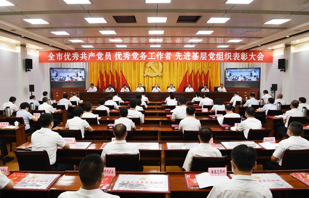 鄭連生講話。劉紀森 攝 上午8時30分,大會正式開始,全體起立,奏唱國歌。來自全市各行各業(yè)、在工作中取得優(yōu)異成績的99名共產(chǎn)黨員、100名黨務工作者和100個基層黨組織,分別被授予“全市優(yōu)秀共產(chǎn)黨員”“全市優(yōu)秀黨務工作者”“全市先進基層黨組織”榮譽稱號。受到表彰的優(yōu)秀個人和先進集體代表先后上臺領獎,會場響起熱烈掌聲。