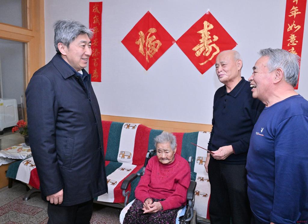 看望慰問困難群眾宋彩蘭。馮曉磊 攝 困難群眾宋彩蘭已經(jīng)101歲,目前住在二兒子家,生活比較困難。朱曉東將米面油、對聯(lián)等慰問品送到家中,與老人進行交談,詢問身體狀況,囑咐老人要保重身體、頤養(yǎng)天年,要求相關部門多關心老人生活,及時幫助解決困難,使老人老有所養(yǎng)、安度晚年。