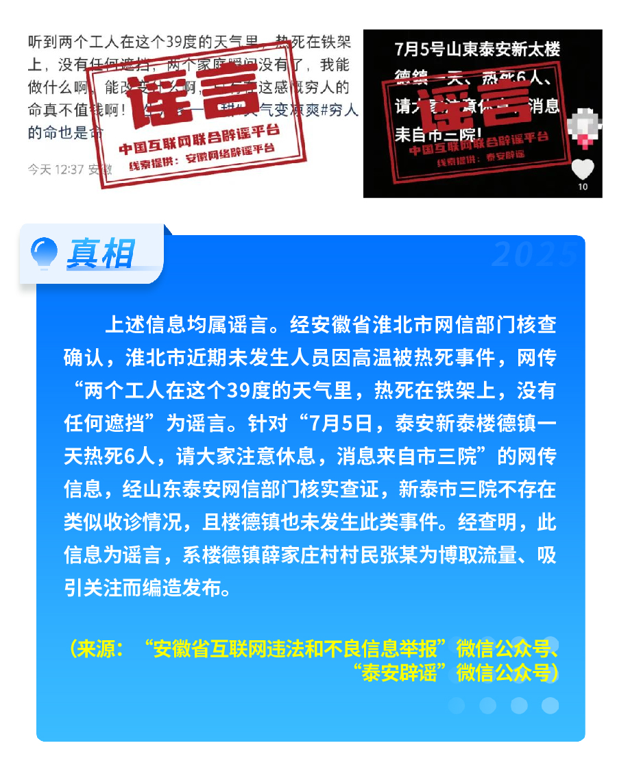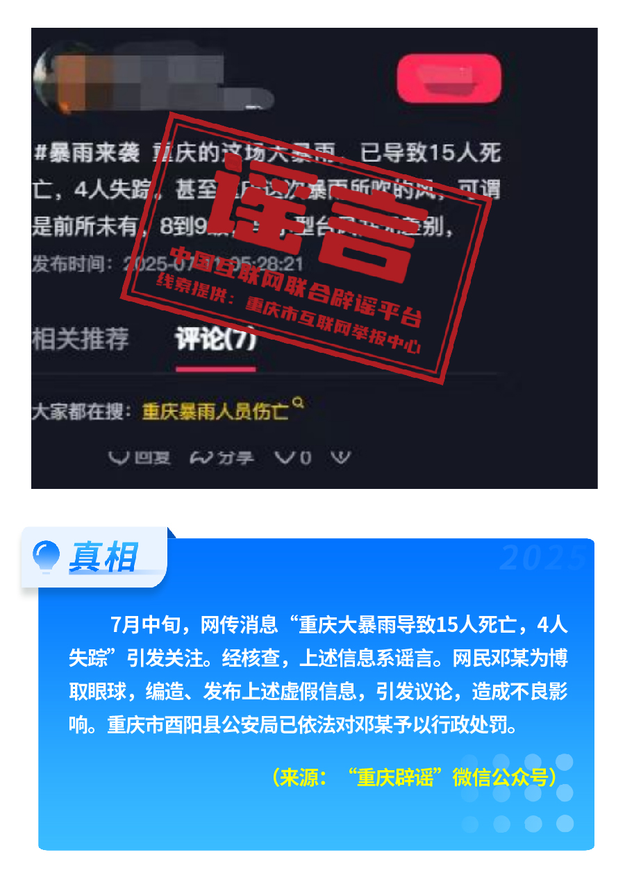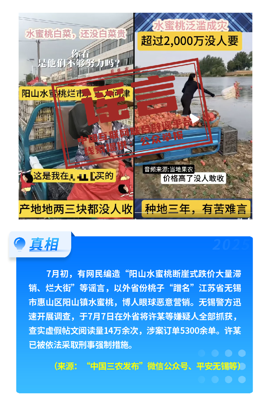 翻炒醫(yī)保舊謠 謊報(bào)地震預(yù)警 偽造警情通報(bào) 網(wǎng)信、公安嚴(yán)打自媒體發(fā)布不實(shí)信息 7月網(wǎng)絡(luò)謠言主要集中在公共政策、突發(fā)事件、社會(huì)民生等領(lǐng)域,假冒權(quán)威、憑空捏造,使用AI合成不實(shí)圖片和視頻,誤導(dǎo)公眾認(rèn)知,污染網(wǎng)絡(luò)生態(tài)。網(wǎng)信、公安等部門重拳出擊,堅(jiān)決打擊。 有人重新翻炒“醫(yī)?!畟€(gè)人賬戶’將全部取消”舊謠,故意歪曲醫(yī)保改革真實(shí)內(nèi)涵,嚴(yán)重誤導(dǎo)公眾對醫(yī)保改革政策的理解?!坝袑H松祥T服務(wù)激活醫(yī)保碼”,披著“公共服務(wù)”的外衣,實(shí)有詐騙之嫌和安全風(fēng)險(xiǎn)。憑空捏造“海南規(guī)定電動(dòng)自行車充電不能過夜、頭盔分三季”這一“奇葩規(guī)定”,以“新規(guī)”話術(shù),擾亂交通管理秩序。 近期,網(wǎng)上接連出現(xiàn)發(fā)布虛假“警情通報(bào)”的惡性造謠傳謠案件,炮制傳播“昆明駕車撞人案131人死亡”“杭州自來水接入糞水”及涉釋永信虛假“警情通報(bào)”,模仿“藍(lán)底白字”格式,杜撰聳人聽聞細(xì)節(jié),損害政府公信力,嚴(yán)重?cái)_亂社會(huì)秩序。“院士預(yù)測廣東將發(fā)生8級以上大地震”公然偽造專家聊天截圖,謊報(bào)地震預(yù)警。還有造謠者借盛夏高溫酷暑與洪澇災(zāi)害,編造“安徽淮北、山東泰安等地多人因高溫死亡” “重慶大暴雨導(dǎo)致15人死亡、4人失蹤”等謠言,蹭炒熱點(diǎn)、煽動(dòng)情緒。 此外,7月份正值暑期旅游旺季和水果等農(nóng)產(chǎn)品收獲季,有自媒體、商家借機(jī)編造傳播涉文旅及農(nóng)產(chǎn)類謠言,干擾市場秩序,侵害消費(fèi)者權(quán)益。有商家違規(guī)使用人民大會(huì)堂建筑圖片標(biāo)識和名稱,仿冒人民大會(huì)堂賬號,非法售賣、倒賣參觀門票,損害游客權(quán)益。個(gè)別商家剪輯發(fā)布“江蘇無錫陽山水蜜桃斷崖式跌價(jià)、大量滯銷、爛大街”謠言視頻,再借機(jī)兜售假冒的陽山水蜜桃,博人眼球惡意營銷,擾亂市場秩序。所謂“峨眉山人猴大戰(zhàn),游客墜崖,猴王被當(dāng)場擊斃”景區(qū)安全事件一度傳得沸沸揚(yáng)揚(yáng),相關(guān)視頻以驚悚情節(jié)博取關(guān)注,畫面實(shí)際是用AI合成拼接制作。 中央網(wǎng)信辦近日開展“清朗·整治‘自媒體’發(fā)布不實(shí)信息”專項(xiàng)行動(dòng),重點(diǎn)整治惡意蹭炒誤導(dǎo)公眾、多種手段歪曲事實(shí)、不做標(biāo)注以假亂真、專業(yè)領(lǐng)域信息不實(shí)等問題。一段時(shí)間以來,網(wǎng)信部門會(huì)同相關(guān)部門依法處置假冒仿冒新聞媒體、政府機(jī)構(gòu)、企事業(yè)單位賬號3008個(gè),形成有力震懾;公安機(jī)關(guān)依法嚴(yán)厲查處造謠傳謠違法行為,上述傳播虛假“警情通報(bào)”以及“院士預(yù)測廣東將發(fā)生8級以上大地震”“海南規(guī)定電動(dòng)自行車充電不能過夜”“重慶大暴雨致15人死亡、4人失蹤”等造謠傳謠者均已被公安機(jī)關(guān)依法予以嚴(yán)厲處罰。 (責(zé)任編輯:梁艷) |