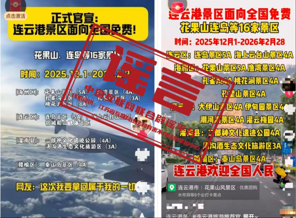 謠言:江蘇連云港景區(qū)“2025年12月1日至2026年2月28日面向全國(guó)免費(fèi)”?