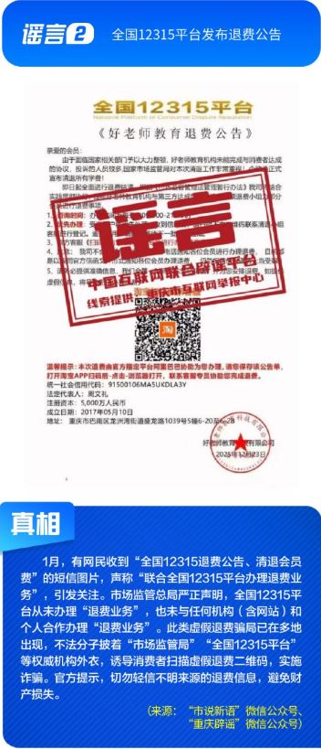 ??公共政策領(lǐng)域謠言誤導(dǎo)公眾決策?!吧绫?]有有效期限制、未到期不能換新卡”是對(duì)社保卡管理政策的誤讀,給民眾平添困擾;“28家博物館元旦期間閉館”實(shí)為少數(shù)博物館根據(jù)運(yùn)營安排所做的微調(diào),網(wǎng)帖嚴(yán)重夸大實(shí)際閉館情況,引發(fā)負(fù)面炒作;“深圳有望推行12年義務(wù)教育,高中免費(fèi)”是對(duì)現(xiàn)行政策的“超前編造”,誤導(dǎo)學(xué)生及家長群體;“全國12315平臺(tái)發(fā)布退費(fèi)公告”,則是假冒監(jiān)管機(jī)構(gòu)名義散播不實(shí)通知,為后續(xù)詐騙行為做鋪墊。