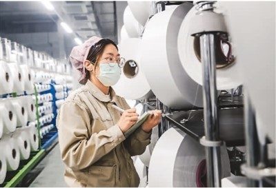 江蘇省宿遷市泗陽(yáng)縣近年來(lái)加快推動(dòng)紡織企業(yè)生產(chǎn)數(shù)字化轉(zhuǎn)型,實(shí)現(xiàn)高質(zhì)量發(fā)展。圖為江蘇芮邦科技有限公司生產(chǎn)車間內(nèi),工人在智能化生產(chǎn)線上作業(yè)。裴 成攝(人民視覺(jué))