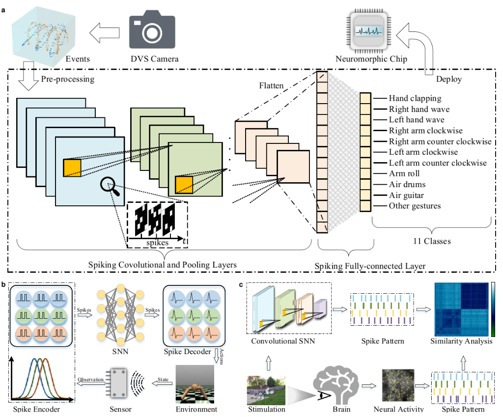 李國齊介紹,傳統(tǒng)脈沖神經(jīng)網(wǎng)絡(luò)框架更多地關(guān)注生物可解釋性,并不支持自動(dòng)微分,無法充分利用GPU的大規(guī)模并行計(jì)算能力,也缺乏對(duì)神經(jīng)形態(tài)傳感器和計(jì)算芯片的支持?!绑@蟄”框架很大程度上解決了上述問題,支持神經(jīng)形態(tài)數(shù)據(jù)處理、深度脈沖神經(jīng)網(wǎng)絡(luò)構(gòu)建和神經(jīng)形態(tài)芯片部署等多項(xiàng)功能。