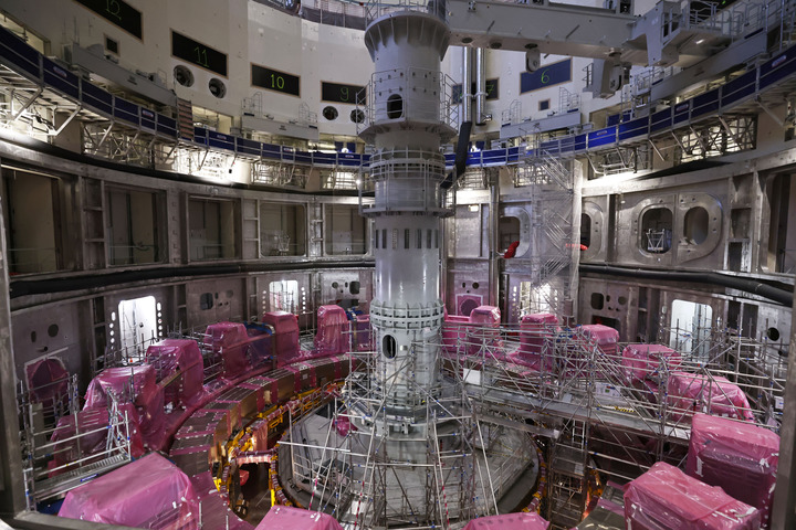 這是11月23日在位于法國圣保羅-萊迪朗斯的國際熱核聚變實(shí)驗(yàn)反應(yīng)堆(ITER)建設(shè)現(xiàn)場拍攝的安裝中的托卡馬克裝置。(梁希之 攝)