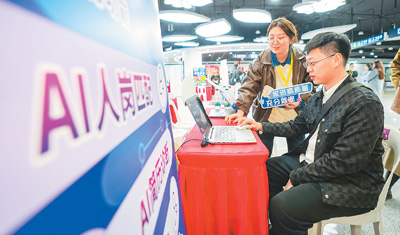 日前,在福建省福州市鼓樓區(qū)安泰街道南門兜地鐵站里舉行的2025年就業(yè)援助月專項(xiàng)活動(dòng)中,工作人員利用AI技術(shù)和大數(shù)據(jù)分析等先進(jìn)技術(shù),為求職者提供智能化的崗位匹配和職業(yè)規(guī)劃建議。謝貴明攝(人民視覺)