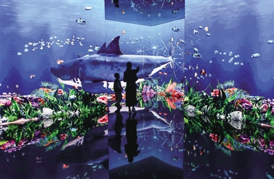 圖為游客在位于濟南市的山東省美術館參觀體驗“無限之?!背两紸I數(shù)字藝術展。新華社發(fā)(郝鑫城 攝)