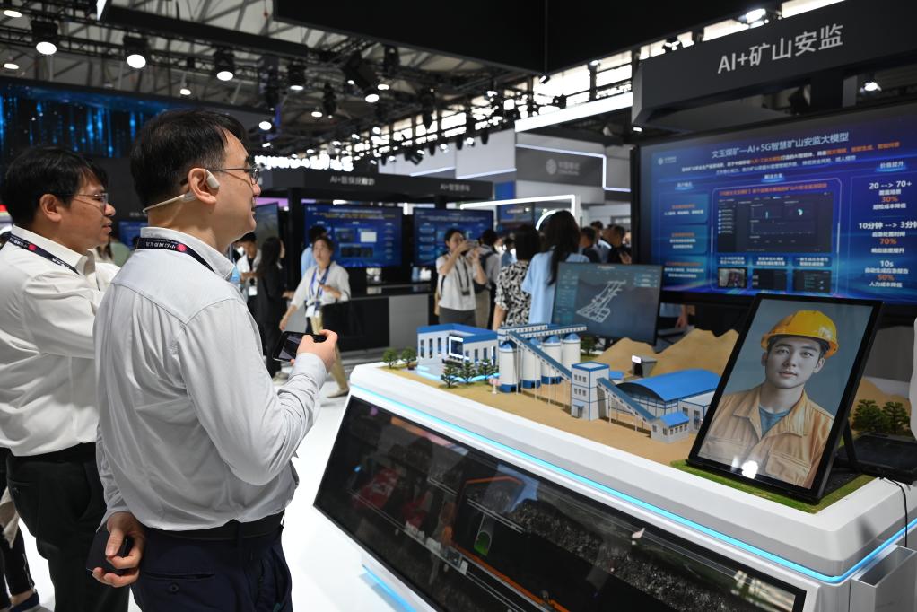6月18日,觀眾在中國移動展臺了解“AI+礦山安監(jiān)”技術(shù)方案。新華社記者 陳愛平 攝