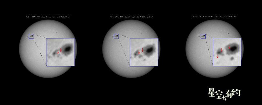 最近3個(gè)X級(jí)耀斑(22日X1.8級(jí)耀斑、22日X1.7級(jí)耀斑和23日X6.3級(jí)耀斑)發(fā)生時(shí)“夸父一號(hào)”白光望遠(yuǎn)鏡拍攝到的影像。(“夸父一號(hào)”研究團(tuán)隊(duì)供圖)