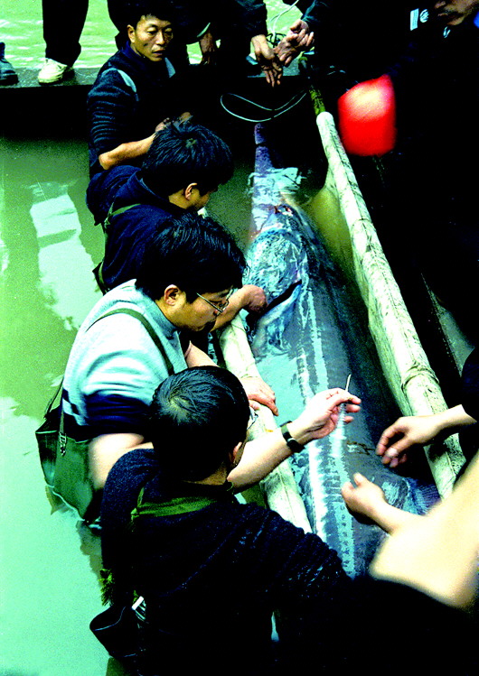 ▲2003年1月27日,在四川宜賓主城區(qū)附近的長江岸邊,專家正在對一只白鱘進(jìn)行救治,這只白鱘是一位漁民在涪溪口發(fā)現(xiàn)的。