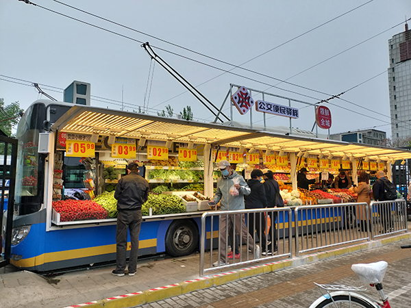 柳芳地鐵站附近開設“公交便民驛?!?,方便居民購買果蔬。人民網(wǎng)實習生 曹瑞穎攝