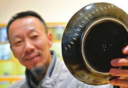 蘆圣杰展示鋦好的瓷器。