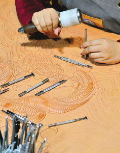 李金云一刀一錘在皮革上作畫。