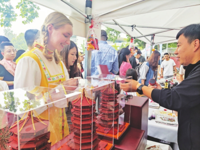 當(dāng)日活動吸引了來自世界各地的3萬余名師生及社會各界人士。獨唱《人說山西好風(fēng)光》《千年一塔》,舞蹈《醋之韻》《翼城花鼓》等贏得師生們熱烈掌聲。在五大洲文化展區(qū),絳州木版年畫傳承人吳百鎖現(xiàn)場印制木版年畫贈送師生,成為一道亮麗風(fēng)景。廣靈剪紙、應(yīng)縣木塔模型、黎侯虎、寧武毛健茶等吸引各國留學(xué)生駐足欣賞?!叭A夏古文明山西好風(fēng)光”主題相框前,無數(shù)外國友人饒有興趣交流互動,拍照留念?!吧轿髟亍被鸨本┱Z言大學(xué)世界文化節(jié)。