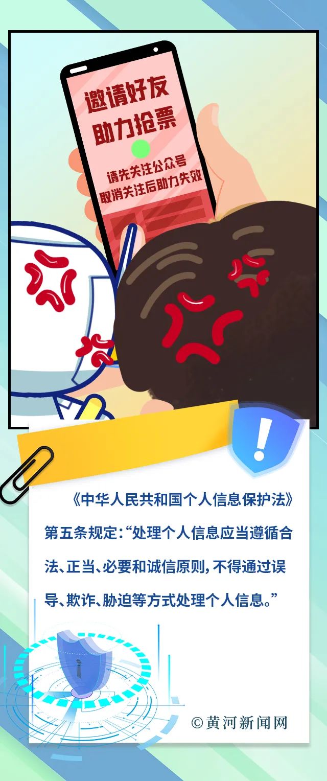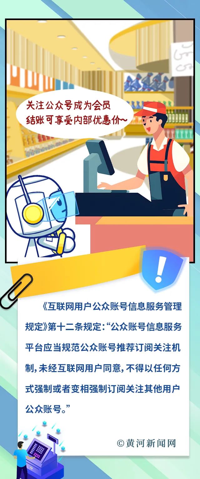 保護個人信息 互聯(lián)網(wǎng)時代,掃碼關(guān)注公眾號遍及消費、學習等各類生活場景中。用戶被要求關(guān)注公眾號,并通過公眾號下單結(jié)賬、助力投票、領(lǐng)取資料等,導致出現(xiàn)被迫授權(quán)個人信息、日常頻繁推送廣告等情況,個人信息泄露的風險加大。 一旦發(fā)現(xiàn)被強制關(guān)注公眾號,怎么辦?可根據(jù)《互聯(lián)網(wǎng)用戶公眾賬號信息服務管理規(guī)定》和《中華人民共和國個人信息保護法》相關(guān)法規(guī)對侵權(quán)者進行舉報或提起訴訟,以此保護個人信息安全。