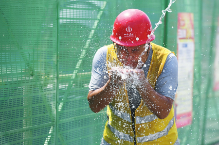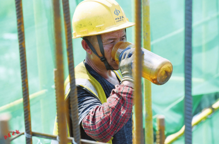 當(dāng)日,是入伏第一天,意味著開始進(jìn)入一年中最熱的時(shí)候。在熱火朝天的施工現(xiàn)場,工人師傅們埋頭苦干,他們雖然戴著自制遮陽帽、冰袖,身旁放著水壺,但一小會(huì)兒工夫就會(huì)汗流浹背。“這樣的杯子,我每天要喝好幾杯水。”天氣太熱,來自四川樂山的林英把杯子里的水一飲而盡。黝黑的皮膚、如雨的汗水、潮濕的后背……當(dāng)大多數(shù)人避暑納涼時(shí),不少勞動(dòng)者卻辛勤地?fù)]灑著汗水,堅(jiān)守在施工一線。在這個(gè)工地上,有很多和林英一樣的打工人,他們來自全國各地,用青春和汗水建設(shè)美麗山西。