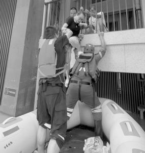 8月1日19時30分許,隊員們剛抵達涿州,就迅速進入能見度只有1米的水域搜救被困者?!按蹇谝话敫叩拈T樓被淹沒,由于天色較晚,加上水面上有濃霧,我們駕駛著兩艘橡皮艇相互配合低速前往尋找被困群眾?!鄙轿餍虑嗄陸本仍牫崭笨傊笓]姚文俊說,因為有豐富的水域救援經驗,他們根據樹木和道路指示牌判定前行方向,將3名被困者轉移到安全地帶。