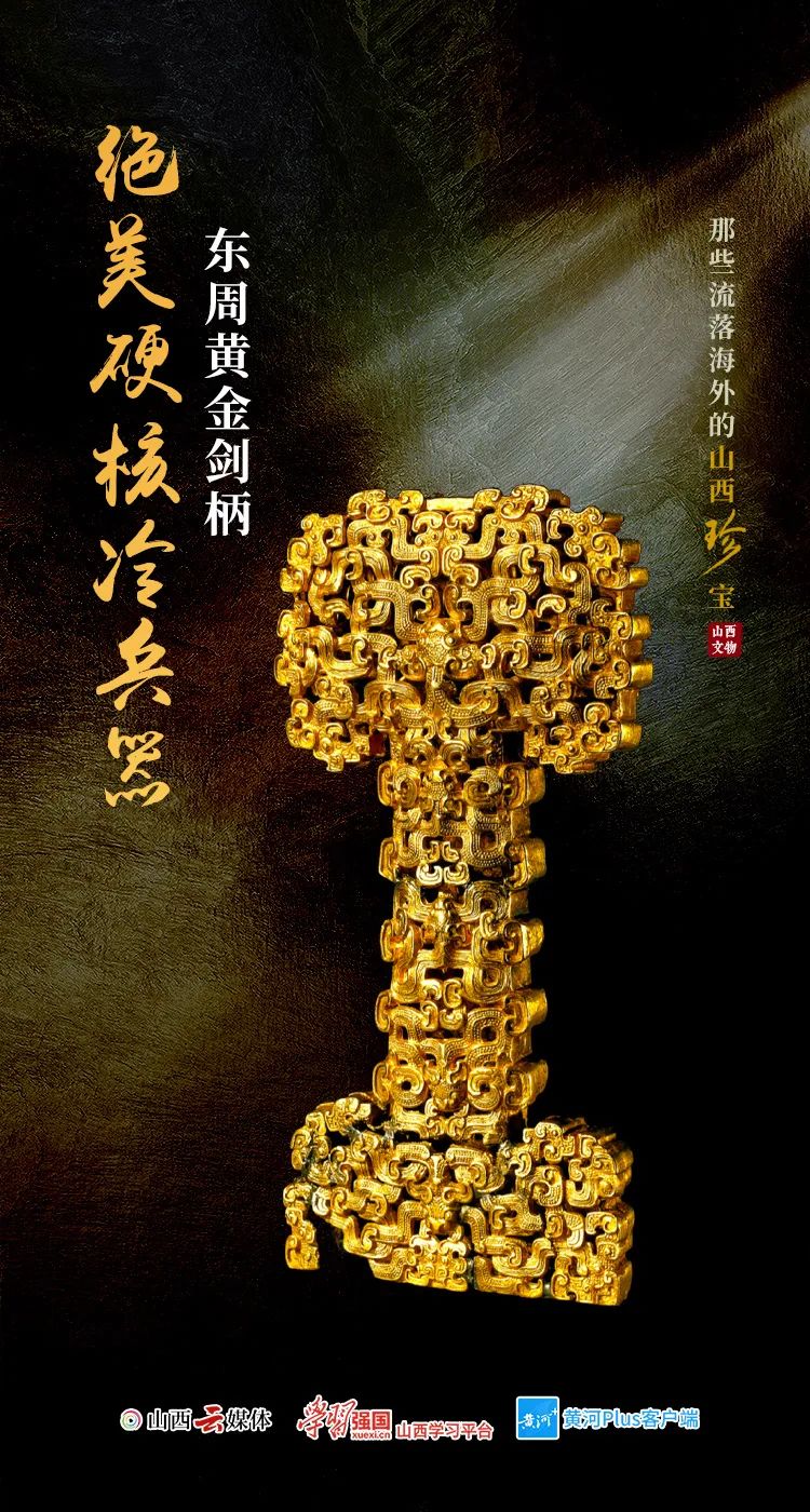 這把黃金劍柄,制作于公元前6至5世紀(jì),長(zhǎng)度9.8厘米,為鏤空雕刻蟠虺紋,做工精細(xì),華麗異常。