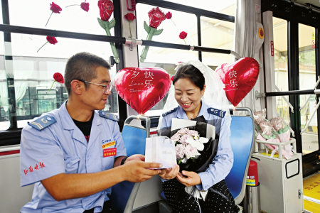 另一對公交夫妻是今年同為39歲的焦更新和李靈,均是812路公交車駕駛員,他們倆是初中同學(xué),當(dāng)天還是他們結(jié)婚第17年的紀(jì)念日。一大早,焦更新就來到車隊,布置車廂,等著妻子的到來?!袄掀牛Y(jié)婚紀(jì)念日快樂!也祝你七夕快樂!”李靈看著鮮花和禮物很是驚訝,走到布置好的車廂后,更是紅了臉?!罢鏇]想到今年的結(jié)婚紀(jì)念日能收到這么大的驚喜,鮮花、浪漫的車廂,還有化妝品,很開心很感動,感謝老公的這份愛意。在工作中,我會把這份愛意傳遞給更多的乘客?!庇兄?2年駕齡的李靈,是一名五星級駕駛員,她在提升駕駛技術(shù)和服務(wù)等方面很是鉆研,工作中還有自己的很多創(chuàng)新,在車廂布置“便民袋”,放上地圖、問候乘客的手繪海報等,細(xì)微的服務(wù)打動了很多乘客,她把車廂當(dāng)成自己的家一樣呵護(hù)。
