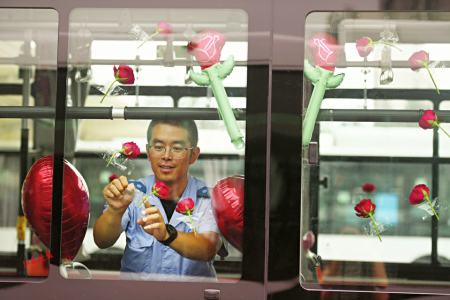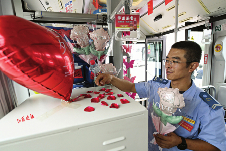七夕節(jié)即將到來,8月8日,在太原公交第三汽車分公司,公交車廂里上演了一場別樣的浪漫——堅守在一線的兩名公交司機(jī)閻樹德和焦更新,分別為出車回來的妻子準(zhǔn)備了大大的驚喜。用送花、提前準(zhǔn)備飯菜、布置車廂等行動表達(dá)自己的愛意。