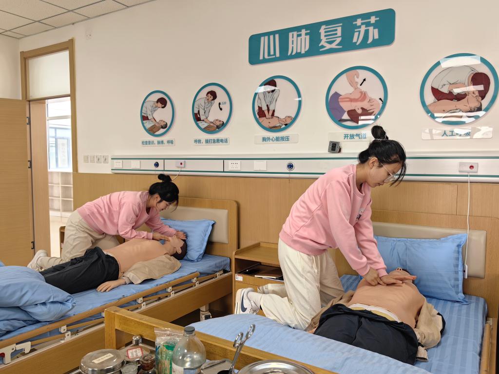 2024年9月25日,山東女子學(xué)院養(yǎng)老服務(wù)管理專業(yè)學(xué)生在練習(xí)心肺復(fù)蘇。新華社記者張力元 攝