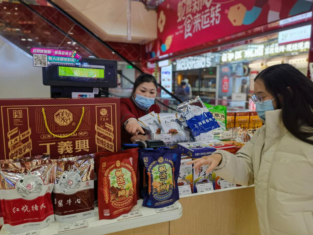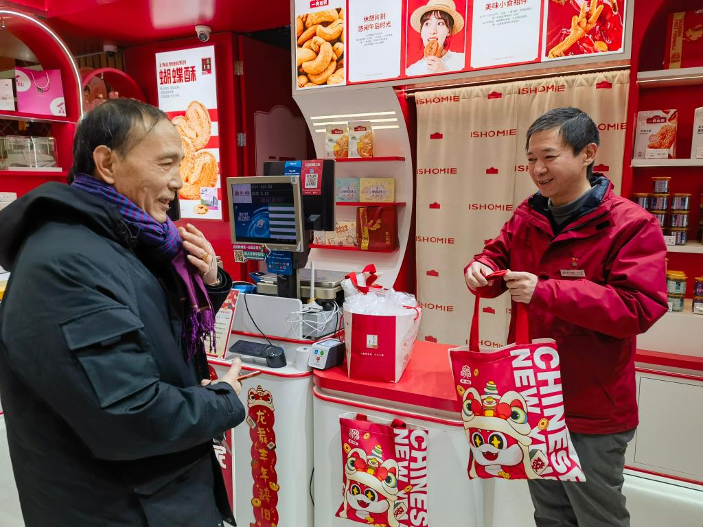 新華社上海1月20日電(記者陳愛(ài)平)走進(jìn)位于南京路步行街的第一食品商店,喜慶紅火的新春裝飾、琳瑯滿目的非遺美食、排隊(duì)精挑細(xì)選年貨的顧客、笑著稱重裝袋的售貨員……過(guò)年的幸福感在掀開擋風(fēng)門簾瞬間“拉滿”。 仔細(xì)逛,這家商店里云集許多非遺美食,老城隍廟五香豆、梨膏糖、功德林素食、楓涇丁蹄、老香齋一口香等等,人們甚至不必前往這些非遺項(xiàng)目的“誕生地”便能“吃遍上?!?。 家住上海市松江區(qū)的七旬市民劉鳳美,乘坐一個(gè)多小時(shí)的地鐵來(lái)到第一食品商店。她選購(gòu)了包裝精美的五香豆、梨膏糖,又散稱了一些炒瓜子、松子、曲奇餅干。盡管當(dāng)下網(wǎng)購(gòu)發(fā)達(dá),老字號(hào)分店遍地都是,劉阿姨仍然堅(jiān)持逢年過(guò)節(jié)來(lái)南京路購(gòu)物的習(xí)慣。