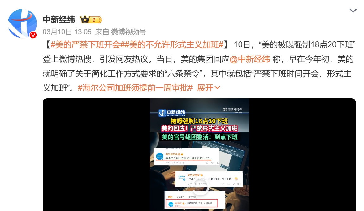 美的回應(yīng)媒體時(shí)表示,今年以來(lái),美的明確了關(guān)于簡(jiǎn)化工作方式要求的“六條禁令”,其中就包括“嚴(yán)禁下班時(shí)間開(kāi)會(huì)、形式主義加班”。