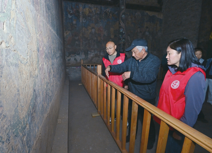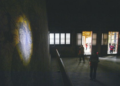 4月10日,山西省文化遺產(chǎn)規(guī)劃研究院勘察設(shè)計團隊在高平仙翁廟正殿內(nèi)借助冷光源進行壁畫病害調(diào)查。