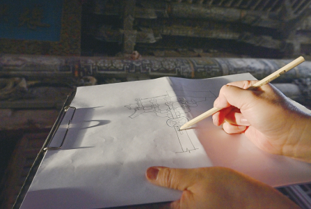 “問診”環(huán)節(jié),團隊成員現(xiàn)場抄錄碑刻、實地走訪文物建筑所在地老者、查閱相關(guān)資料典籍求問古人,“問詢”建筑歷史沿革及修繕記錄,制定針對性修復(fù)方案。